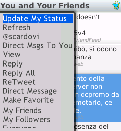 I menu in ogni schermata sono enormi, le funzioni (come anche le impostazioni) del programma sono tantissime ed ancora non ho finito di scoprirle. Tutto questo comunque non rallenta il mio BlackBerry 8100 anche se ho impostato di scaricare ogni 10 minuti i nuovi twit (e dunque l’applicativo rimane attivo in background e non chiuso).