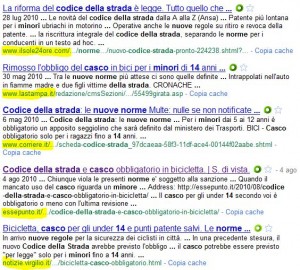 Ad esempio ora il mio post sul nuovo codice della strada e casco per la bici compare in prima pagina (se non in prima posizione) con molte combinazioni di keyword nonché, come di mostra lo screenshot qui a lato, anche in bella compagnia.